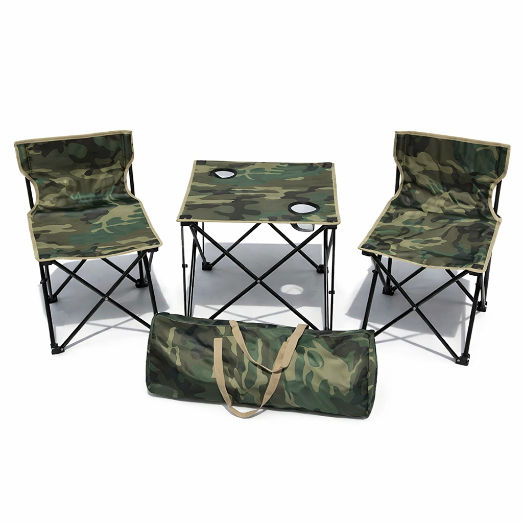 Include masă cu suport pentru pahare, geantă de transport și design verde camuflaj pentru utilizare outdoor.