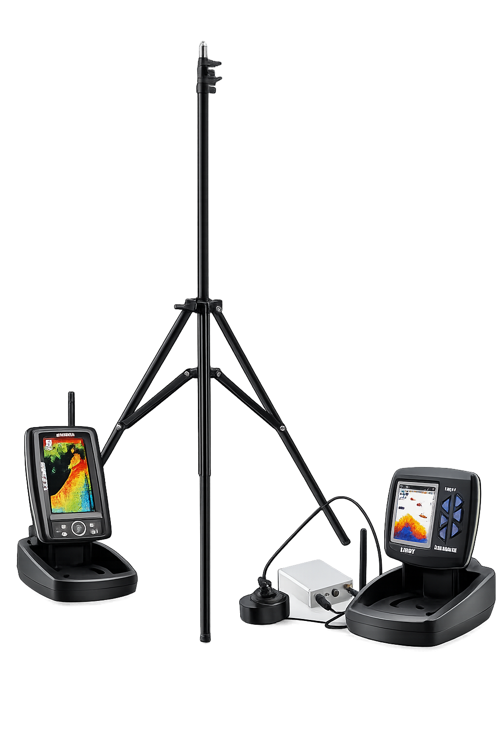 Trepied profesional pentru sonar de pescuit, conceput pentru stabilitate, reglaj precis și utilizare în condiții outdoor.